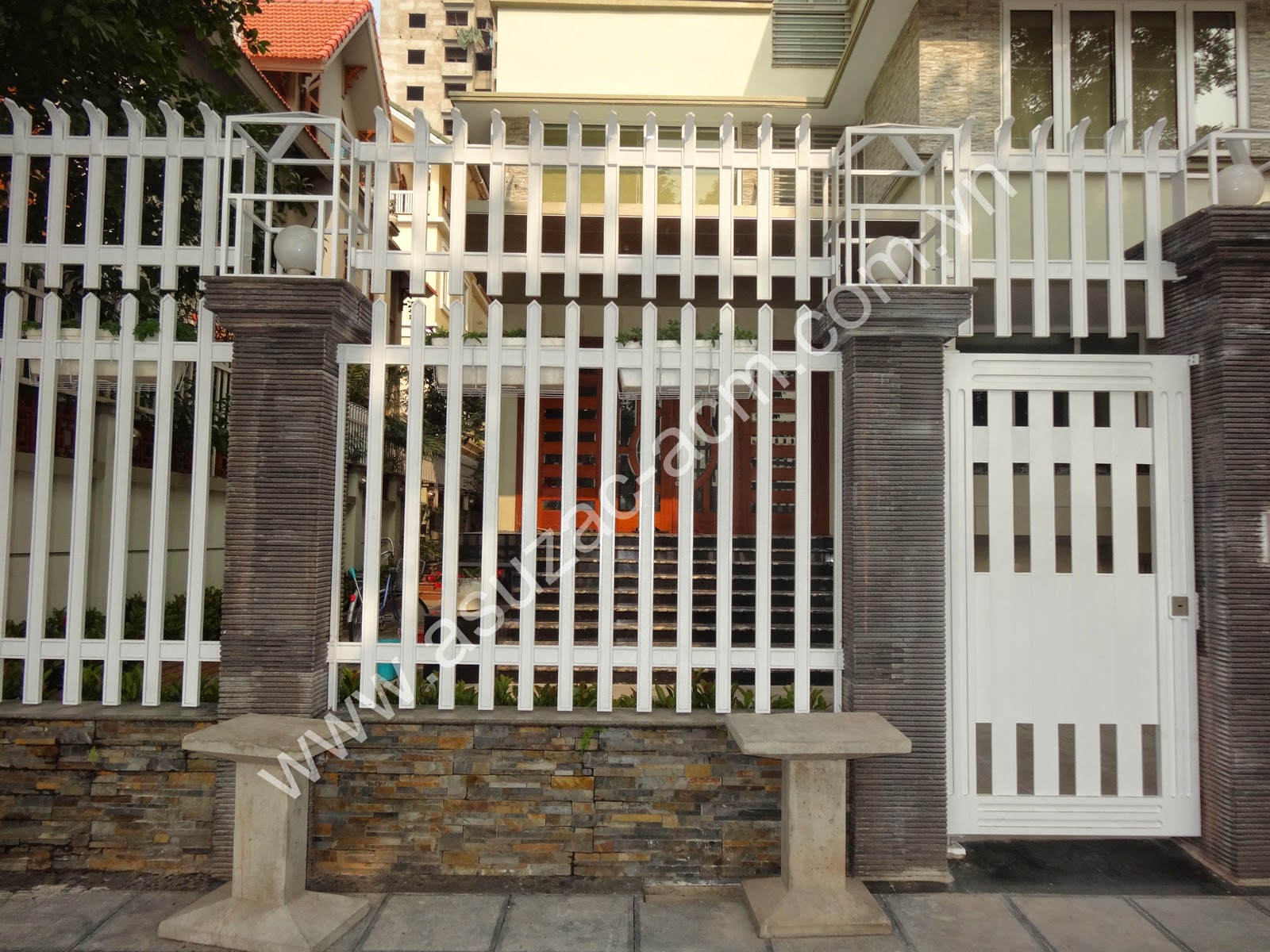 Cổng nhôm đúc màu giả cổ với hàng rào nhôm sơn trắng.