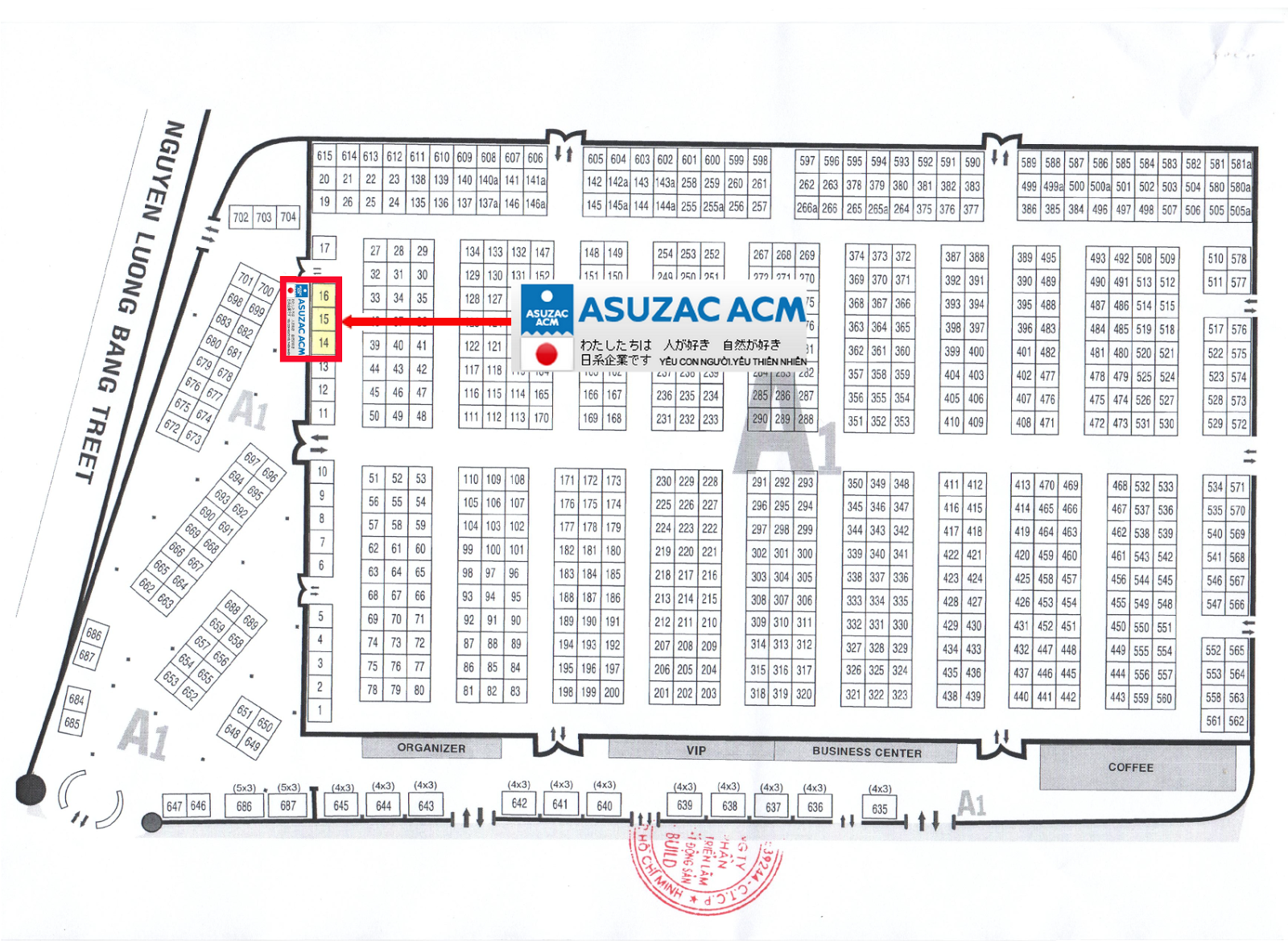 Trong kỳ triển lãm này, các sản phẩm nhôm đúc của ASUZAC ACM được trưng bày tại các gian hàng số 14-15-16khu A1, quý khách có thể tham khảo sơ đồ hướng dẫn đưới đây. Rất mong nhận được sự quan tâm của quý khách hàng và các đối tác. Quý khách đến thăm gian hàng trong thời gian triển lãm sẽ nhận được những tư vấn hữu ích cho ngôi nhà của mình cùng với nhiều phần quà có ích.